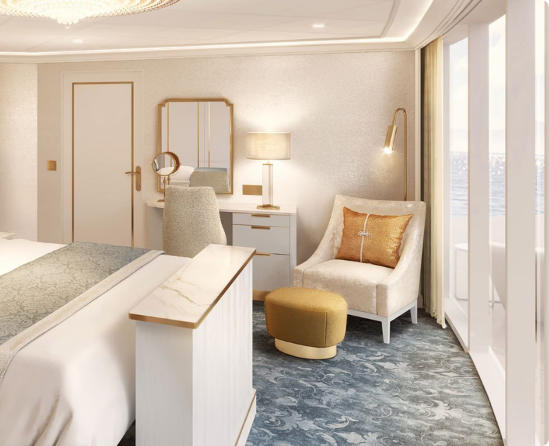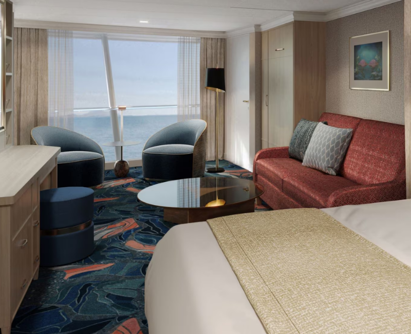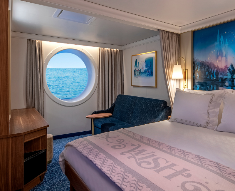 Cabina con vista al mar de 16,8 a 32,4 m², para hasta 5 personas, con gran ventana tipo ojo de buey.