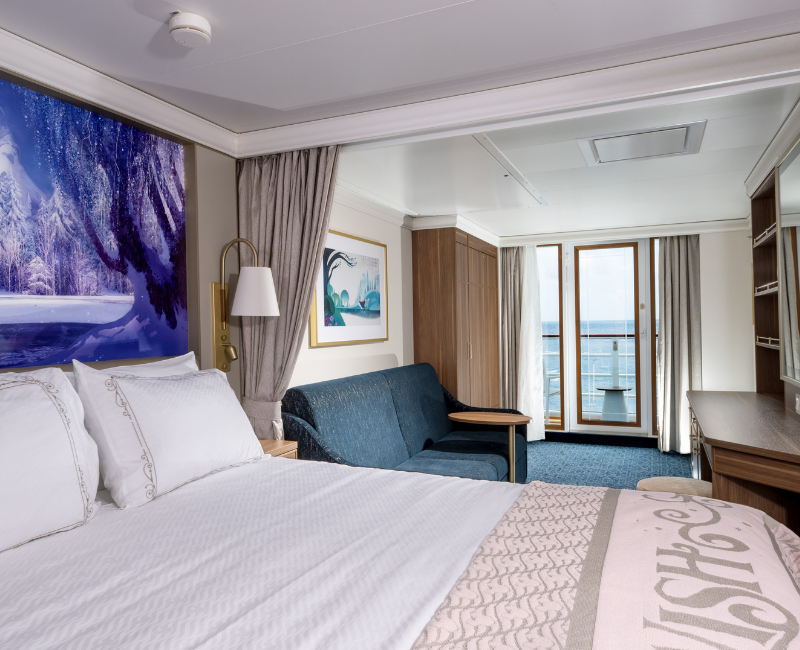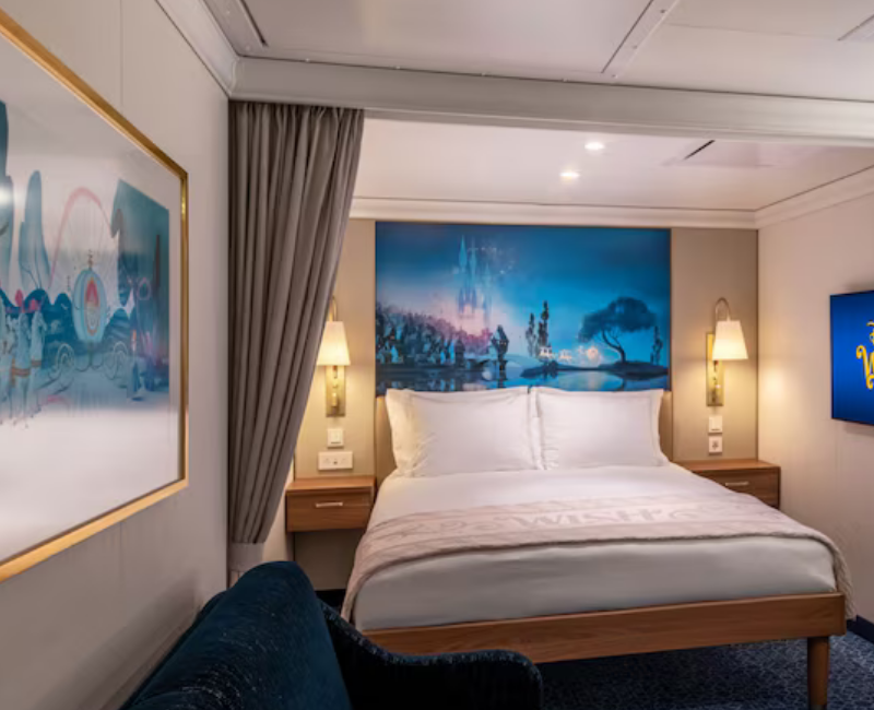 Cabina interior de 15,7 m², ideal para 3–4 personas, sin vista exterior, con detalles temáticos Disney.