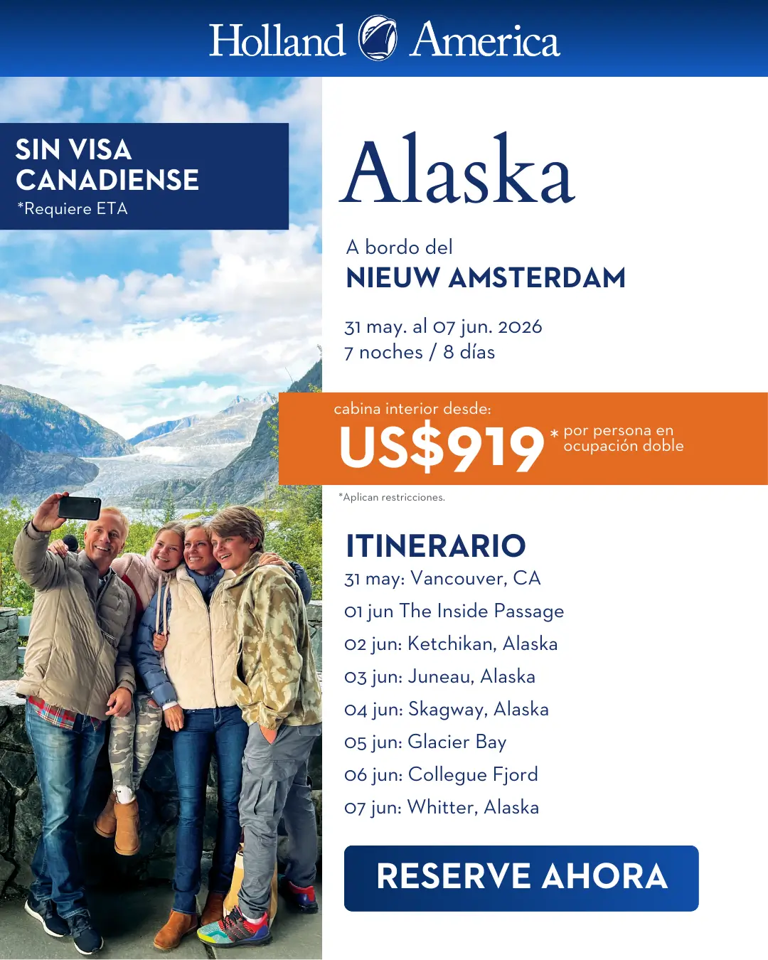 US$919 - Explora Alaska este 2026 a bordo del Nieuw Amsterdam: fiordos, glaciares y paisajes que te dejan sin aliento. 7 noches de aventura, naturaleza y momentos inolvidables