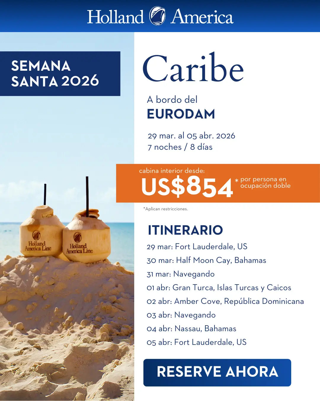 Itinerario: Ft. Lauderdale, Half Moon Cay, Gran Turca y Caicos, Amber Cove, Nassau y Ft. Lauderdale